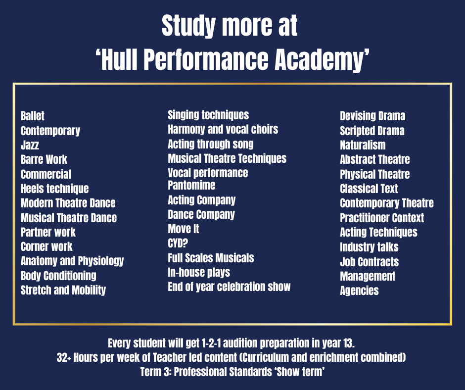 Hull Performance Academy at SM6 offers over 30 hours a week of professional-level training in dance, acting and musical theatre, preparing students not just for assessments but for real-world auditions, performances and careers. As part of St Mary’s College Sixth Form, students also benefit from strong academic support, excellent pastoral care, and clear pathways to drama school, university or industry. With small class sizes, national performance opportunities, and a full summer term dedicated to rehearsal and a final showcase, the Academy combines expert teaching with personalised support. It’s a unique environment where individuality is celebrated, ambition is nurtured and students become part of a passionate, high-performing community.