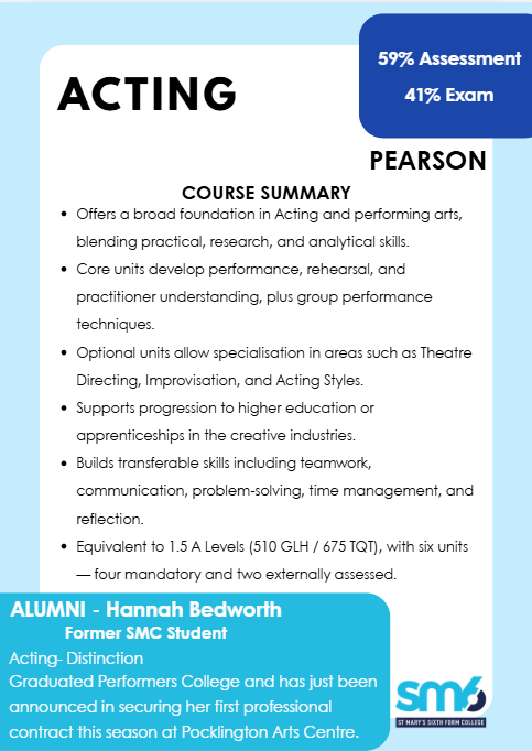 The Level 3 BTEC Foundation Diploma in Acting offers an intensive, practical introduction to performance and theatre. Students develop acting techniques, voice and movement skills, and explore a range of performance styles through workshops, rehearsals, and public productions. Core units include Investigating Practitioners’ Work, Developing Skills and Techniques for Live Performance, and Group Performance Workshop. Assessment combines internally marked coursework with externally assessed written and practical tasks. The course emphasizes creativity, collaboration, and critical reflection, preparing learners for further study in acting or performing arts. It’s ideal for those passionate about theatre and committed to developing their craft.