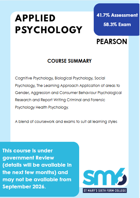 The Level 3 BTEC Extended Certificate in Applied Psychology offers a practical and theoretical introduction to psychological principles and their real-world applications. It includes four units: Psychological Approaches and Applications, Conducting Psychological Research, Health Psychology, and Psychological Disorders and Treatment. Students explore key theories, research methods, and issues like stress, addiction, and mental health. Assessment is split between external exams and internal coursework, with an emphasis on applying knowledge to contemporary scenarios. The course develops analytical, research, and communication skills, preparing learners for higher education or careers in psychology, health, social care, or related fields.