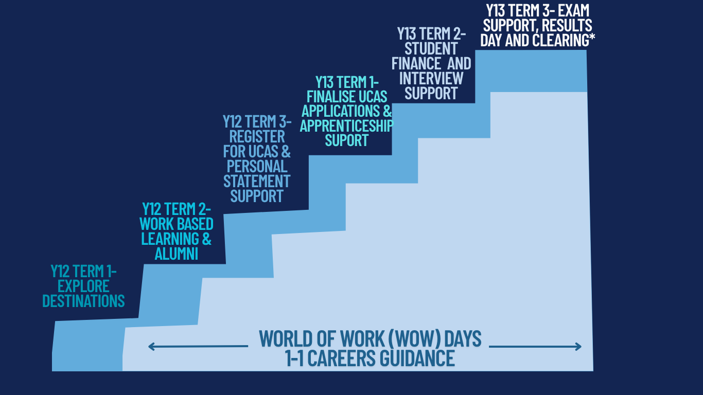 All students follow the core careers pathway which allows them to explore all options post-18 inclusive of employment and apprenticeship pathways, gain on the job experience, develop an excellent academic and professional profile, construct stand out applications and excel at interview.