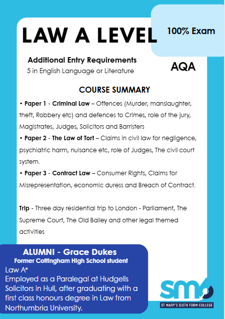 A Level Law introduces students to the English legal system and both public and private law. It develops analytical thinking, problem-solving, and legal reasoning. The course covers The Nature of Law and the English Legal System, Criminal Law, Tort, and Contract Law. Students explore legal rules, institutions, and processes such as statutory interpretation and judicial precedent. Assessment is entirely exam-based, using a mix of question types. The course encourages engagement with real-world legal issues and supports progression to higher education or careers in law-related fields.