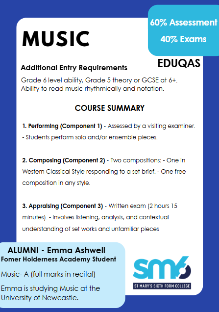 Entry Requirements: GCSE Grade 5 Music or above and Grade 5 Instrumental or Vocal Proficiency