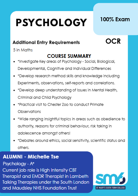 A-level Psychology explores human behaviour through scientific investigation and psychological theory. Students study key areas such as Research Methods, Biological, Cognitive, Social, and Developmental Psychology, as well as Mental Health and Criminal Psychology. The course emphasises critical thinking, data analysis, and ethical considerations. Assessment includes three written exams covering core studies, applied psychology, and research methods. Students evaluate classic and contemporary studies, apply psychological concepts to real-world issues, and develop investigative skills. This specification prepares learners for further study and careers in psychology, healthcare, education, and other fields requiring analytical and interpersonal insight.