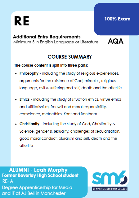 A-level Religious Studies specification explores philosophical, ethical, and theological issues through the study of religion and belief. Students examine topics such as Philosophy of Religion, Ethics, and the in-depth study of Christianity. The course encourages critical analysis of arguments, evaluation of religious teachings, and reflection on contemporary moral issues. Assessment is entirely exam-based, with two written papers testing knowledge, interpretation, and essay writing. The specification fosters independent thinking and prepares students for further study in theology, philosophy, or careers requiring analytical and ethical reasoning.