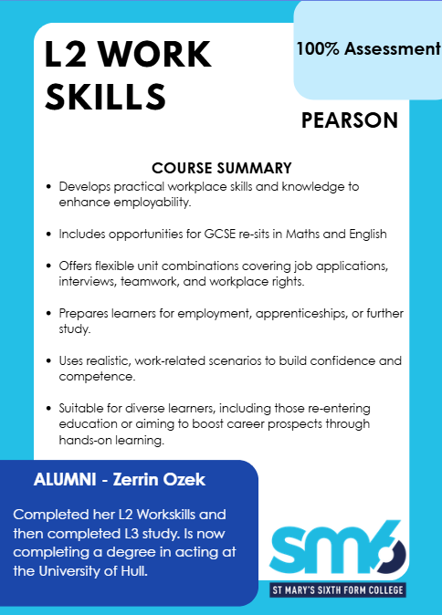 The Pearson BTEC Level 2 Workskills qualification is designed to enhance learners’ employability by developing practical skills and knowledge for the workplace. It includes GCSE re-sits in Maths and English. It offers flexible pathways through various unit combinations, covering topics like job applications, interview techniques, teamwork, and workplace rights. It supports progression into employment, apprenticeships, or further study. Learners engage in realistic, work-related scenarios to build confidence and competence. The course is suitable for a wide range of learners, including those re-entering education or seeking to improve their career prospects through hands-on, skills-based learning.