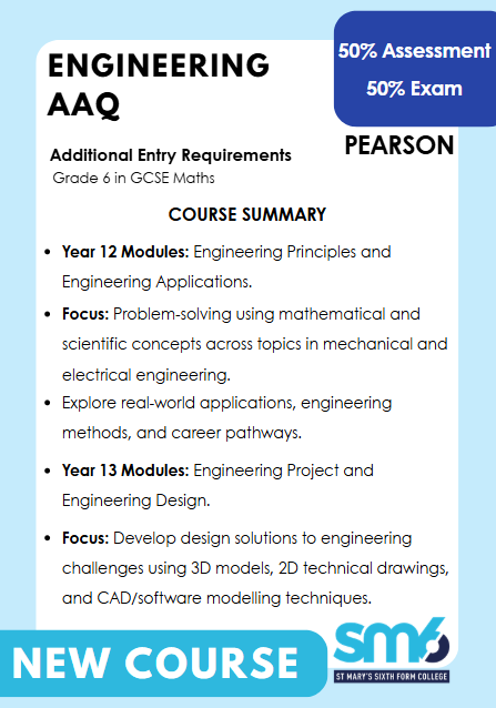 A vocational qualification equivalent to one A-level, designed for students aiming for higher education or careers in engineering. It includes four mandatory units: Engineering Principles, Engineering Applications, Engineering Design, and an Engineering Project. The course blends theoretical knowledge with practical skills, covering topics like mathematical techniques, CAD design, and project management. Assessment is split evenly between external exams and internal coursework. The qualification emphasizes problem-solving, technical understanding, and real-world application, preparing learners for university study, apprenticeships, or employment in various engineering sectors.