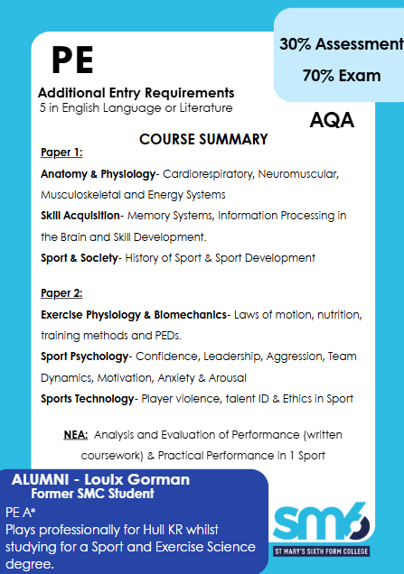 A-level Physical Education combines theoretical knowledge with practical performance to develop a holistic understanding of sport and physical activity. Students study topics such as Anatomy and Physiology, Skill Acquisition, Sport and Society, Exercise Physiology, Biomechanics, and Sport Psychology. The course also explores the role of technology in sport. Assessment includes two written exams and a non-exam assessment (NEA) based on practical performance and analysis. The specification encourages critical thinking, data interpretation, and application of theory to real-world sporting contexts, preparing students for further study or careers in sport science, coaching, or physical education.