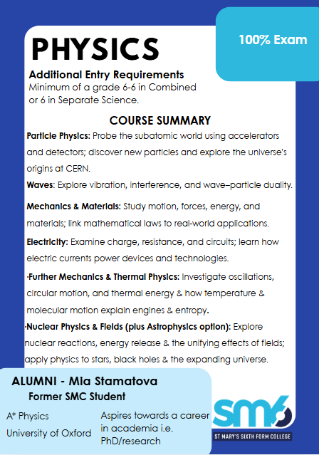 A-level Physics builds a deep understanding of physical principles and their real-world applications. It covers core topics such as Measurements and Errors, Particles and Radiation, Mechanics, Electricity, Waves, Fields, Nuclear Physics, and Thermal Physics. Students also explore optional topics like Astrophysics or Medical Physics. The course emphasizes mathematical skills, practical investigations, and analytical thinking. Assessment is exam-based, with three written papers testing theoretical knowledge, data analysis, and practical understanding. The specification prepares students for STEM degrees and careers by fostering problem-solving abilities and a rigorous scientific mindset.